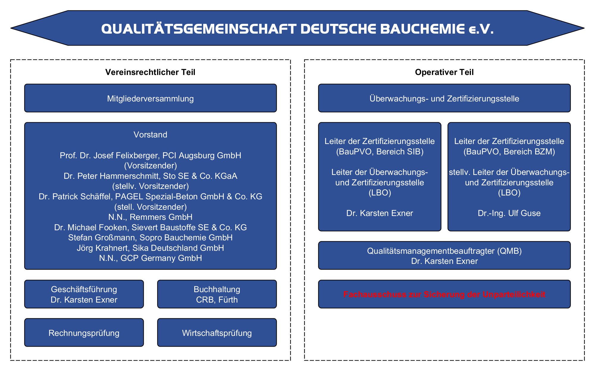 Der Vorstand besteht aus dem Vorsitzenden (Prof. Dr. Josef Felixberger), zwei Stellvertretern (Dr.-Ing. Peter Hammerschmitt und Dr.-Ing. Patrick Schäffel) und bis zu sieben weiteren Vorstandsmitgliedern. Die Positionen für Remmers GmbH und GCP Germany GmbH sind z.Zt. nicht besetzt.