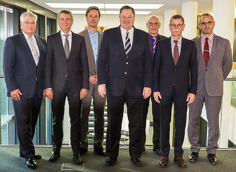 Bildtext: Die Zusammensetzung des QDB-Vorstandes 2020 ist bis auf eine Änderung dieselbe wie 2018, als das Foto entstand (v.r.) Stefan Großmann (Sopro Bauchemie GmbH), Dr.-Ing. Peter Hammerschmitt (Sto SE & Co. KGaA), Axel Ostgathe (GCP Germany GmbH, inzwischen aus dem Gremium ausgeschieden), Prof. Dr. Josef Felixberger (PCI Augsburg GmbH), Dr.-Ing. Patrick Schäffel (PAGEL Spezial-Beton GmbH), ), Dr. Heinz Ephardt (Sika Deutschland GmbH), Norbert Schröter (Geschäftsführendes Vorstandsmitglied). Foto: QDB